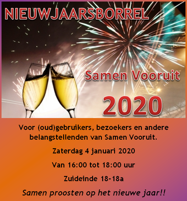 Wij willen dan met (oud)gebruikers van het pand 'Samen Vooruit', cliënten, leden, bezoekers en andere belangstellenden proosten op het nieuwe jaar.